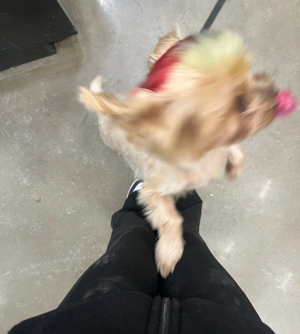 Chase arrived with red and yellow highlights dyed into his fur, adding to his already larger-than-life personality. Oh btw I guess all Shorkies can dance.